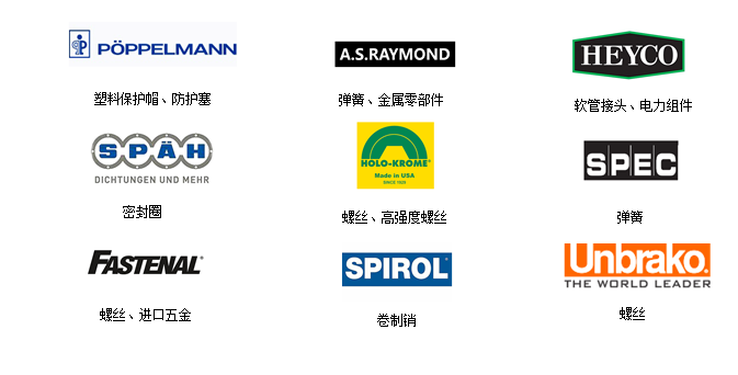 五金品牌:Unbrako、HOLO-KROME、SPEC、FASTENAL、KORNYLAK、Busak+Shamban、KAPSTO、SPAH、SPIROL、WALDES TRUARC、HEYCO、ROTARY SYSTEMS、POPPELMANN、A.S.RAYMOND等